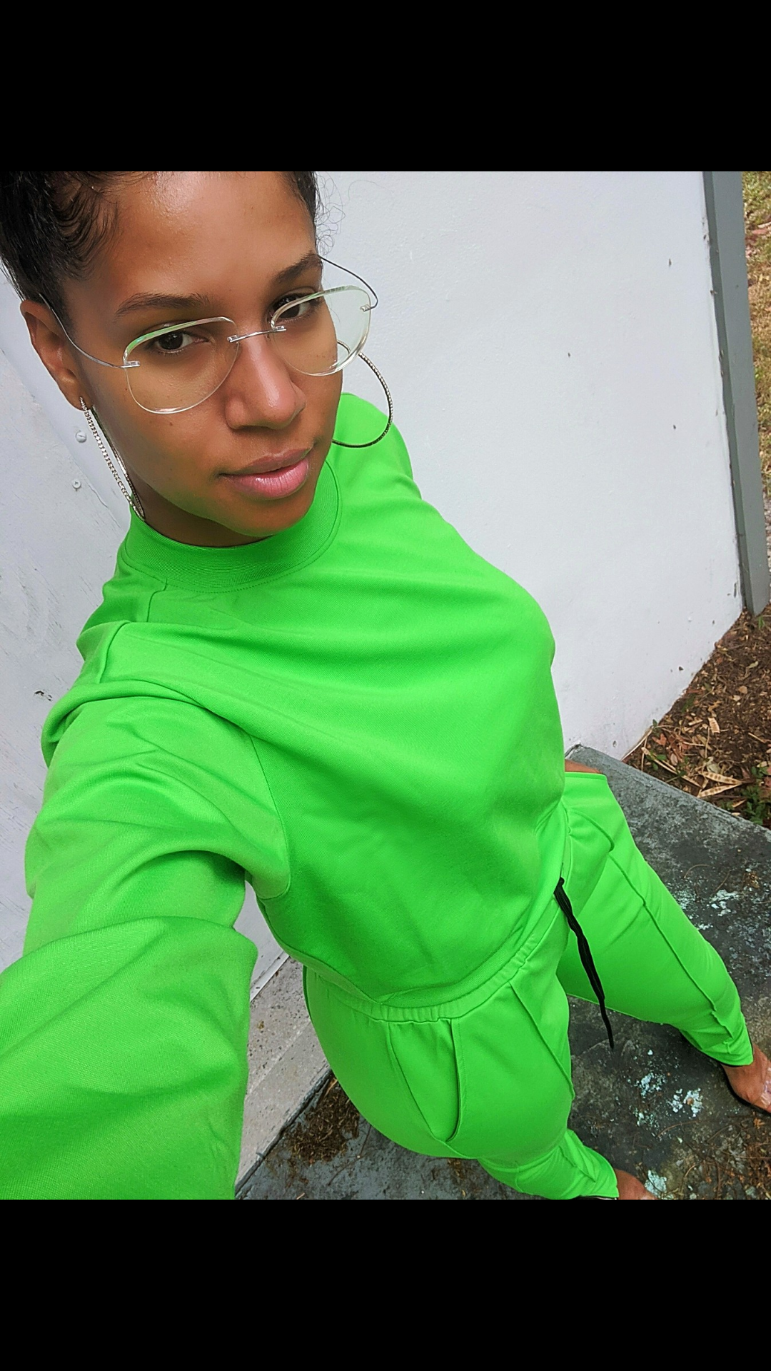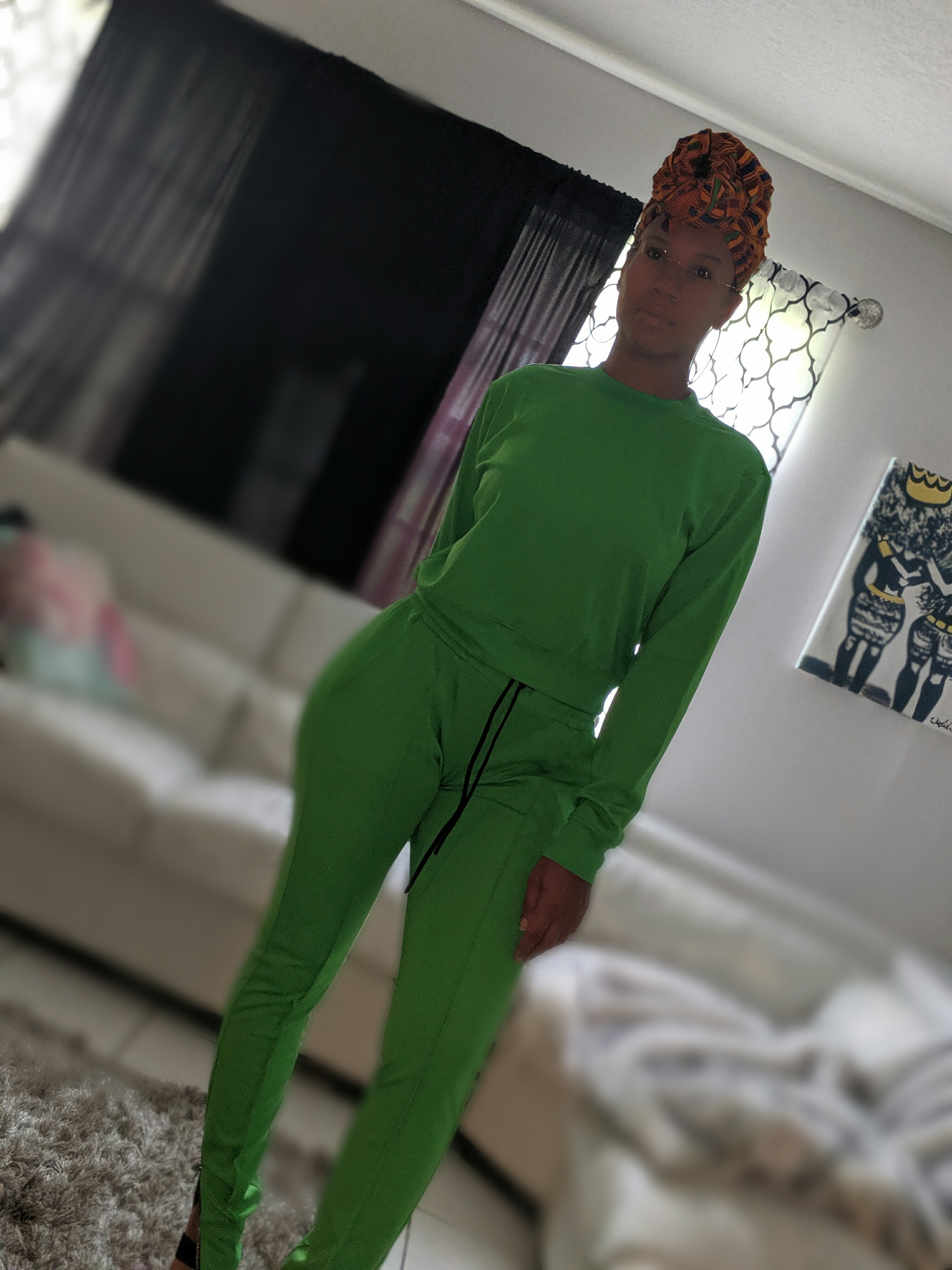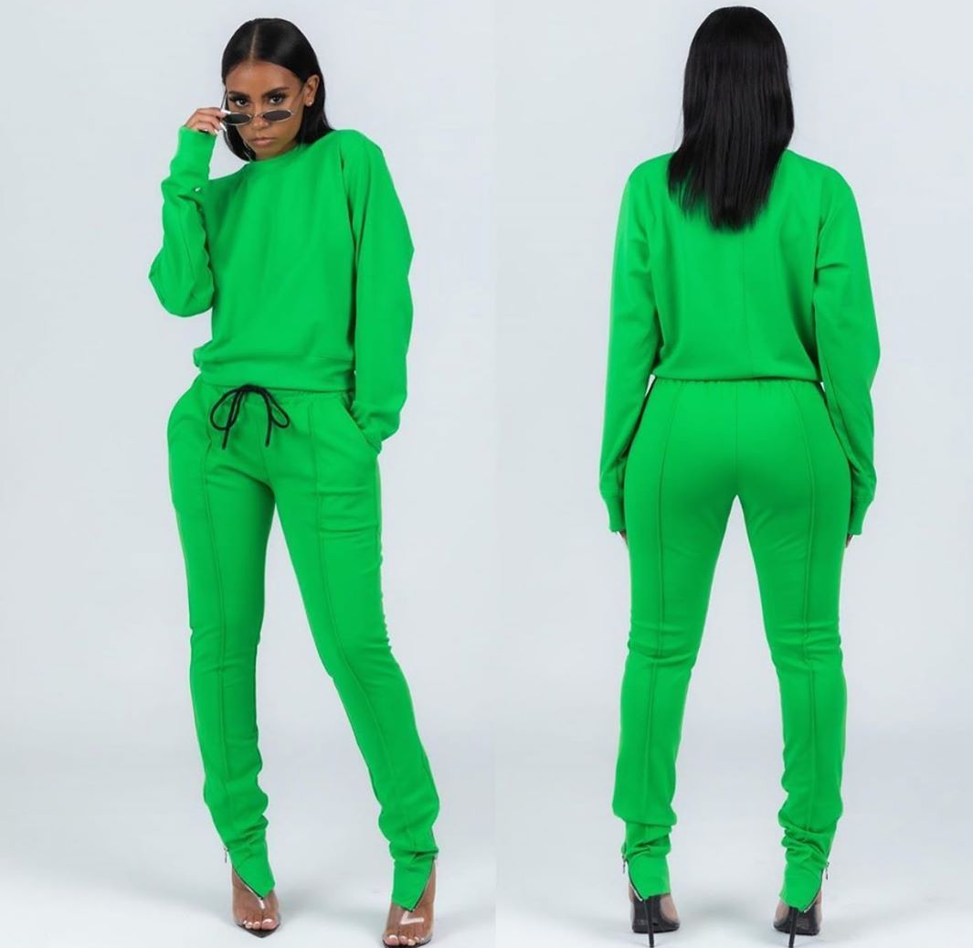 LONG SLEEVE JOGGER SET. ZIPPER AT THE ANKLE WITH BLACK ACCENTS AND BLACK TIE AT WAIST. CAN BE DRESSED UP OR DOWN. THICK MATERIAL, GREAT STRETCH.