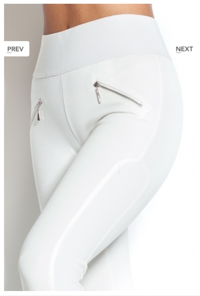 Thick elastic waist band gives extra support and tummy control for a smooth look. Diagonal zippers on each hip. (Modeled with Foxy Cardigan and Mocha crp) 71% cotton 17% nylon 12% spandex