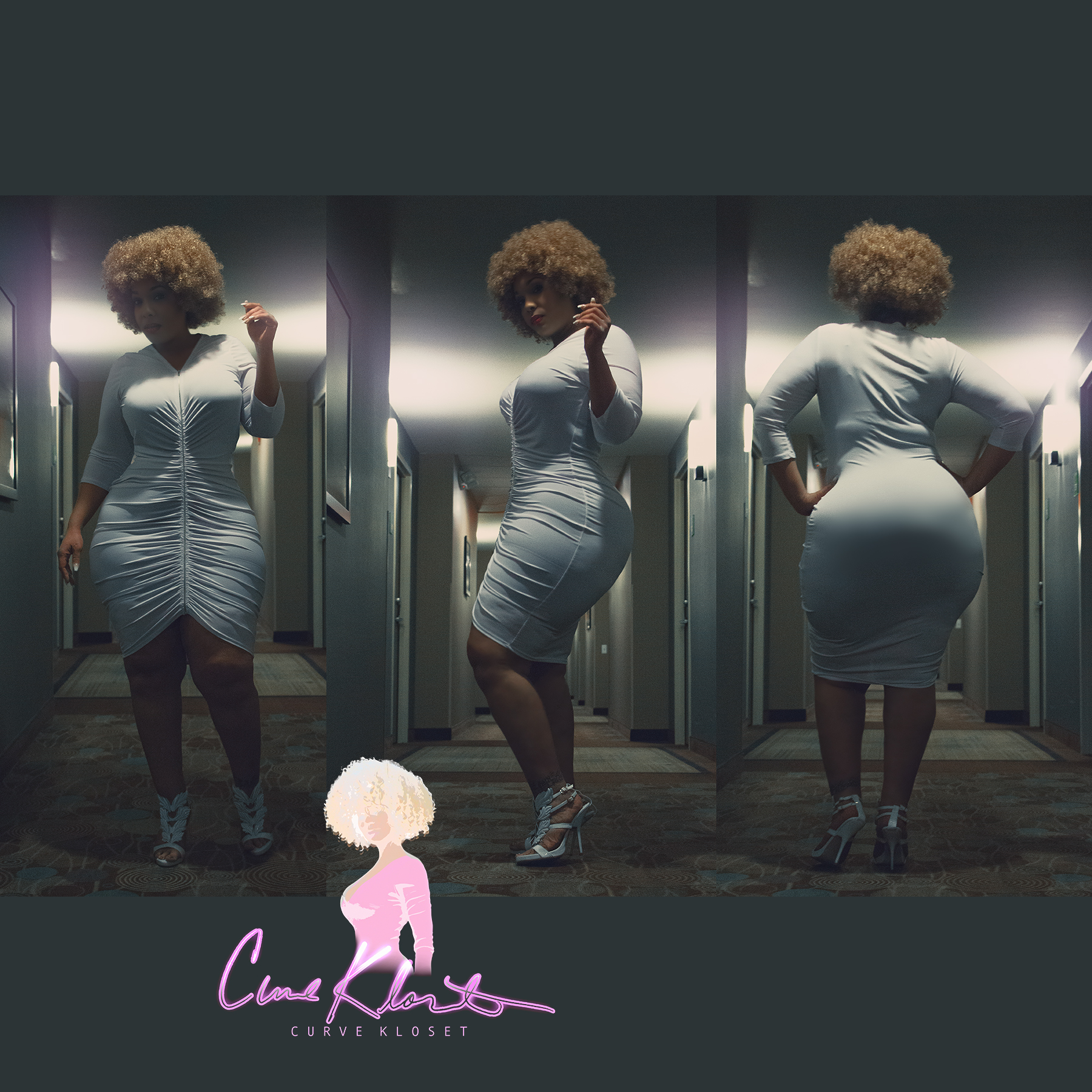 PURE WHITE *PLUS* SOLID KNIT BODY-CON DRESS WITH A V-NECK, GOLD FRONT ZIP CLOSURE, RUCHED FRONT AND 3/4 LENGTH SLEEVES. 95% poly 5% spandex