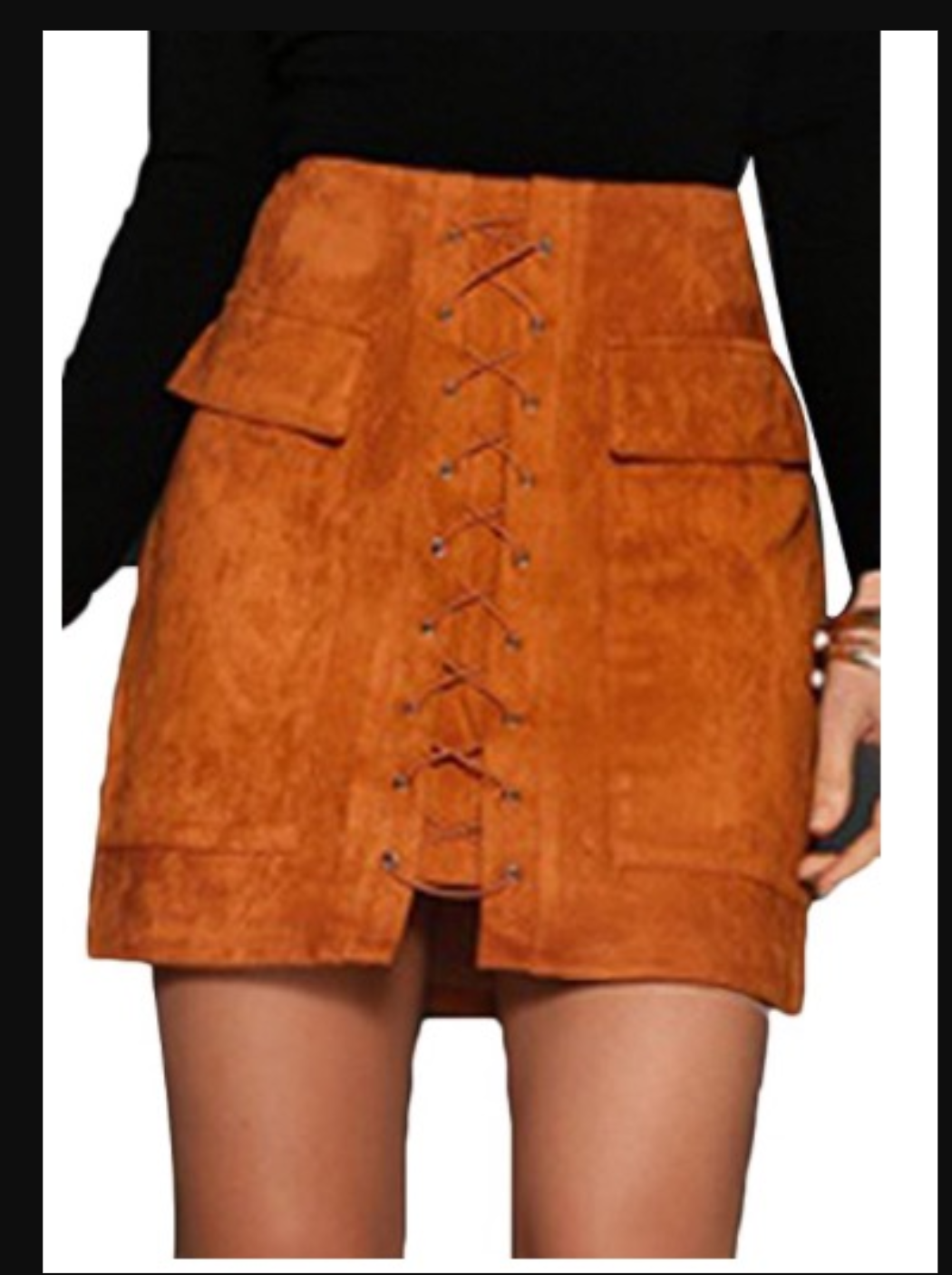 FAUX SUEDE CENTER LACE UP SKIRT. POCKETS ON EACH SIDE AND ZIPPER BACK. GREAT STRETCH.