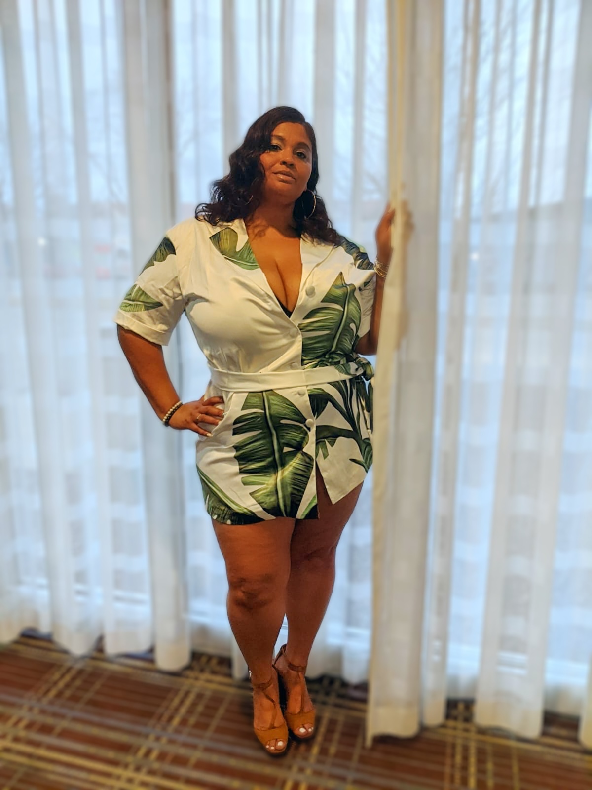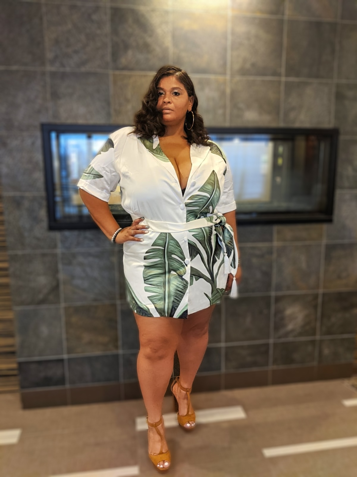 Large Leaf Print Plus Shirt Dress features a collared neckline, short sleeves, and a relaxed bodice. A flowy shift silhouette falls to a flirty mini hem with a full button placket and a tying sash belt.